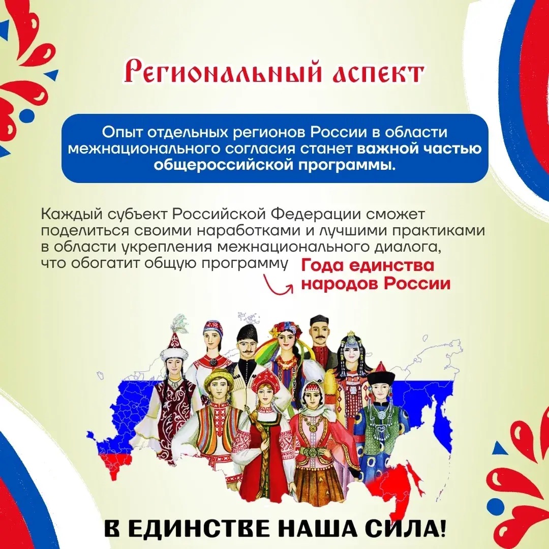 В рамках Года единства народов России планируется широкая программа событий. Она включает фестивали народных культур, выставки, концерты, театральные проекты, а также научные и общественные форумы, посвящённые вопросам межнациональных отношений.