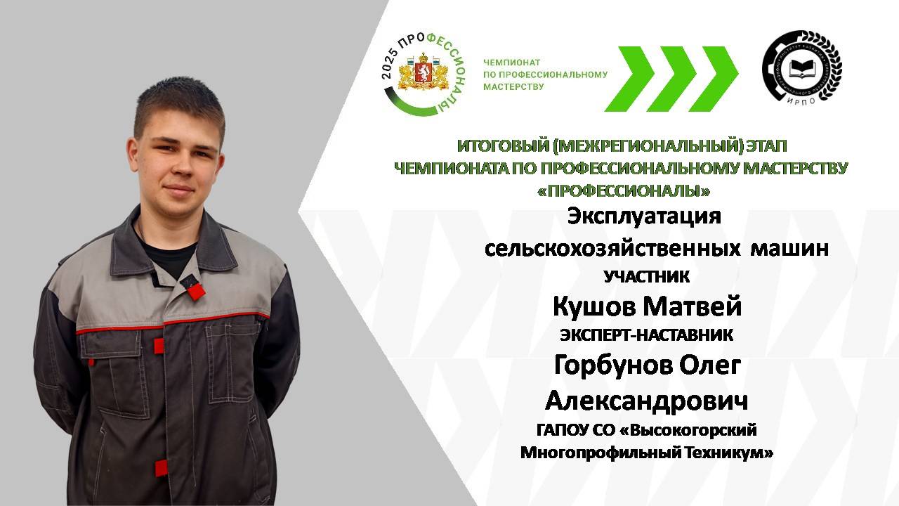 С 08.04.25 г. по 10.04.25 г. состоится Итоговый (межрегиональный) этап чемпионата по профессиональному мастерству "Профессионалы", который будет проходить в Красноярском крае. Наш техникум будет представлять победитель Регионального чемпионата "Молодые профессионалы" в Компетенции "Эксплуатация сельскохозяйственных машин" студент 1 курса группы 125 филиала с.Лая Кушов Матвей, обучающийся по специальности "Эксплуатация и ремонт сельскохозяйственной техники и оборудования". Эксперт наставник Матвея мастер производственного обучения Горбунов Олег Александрович.