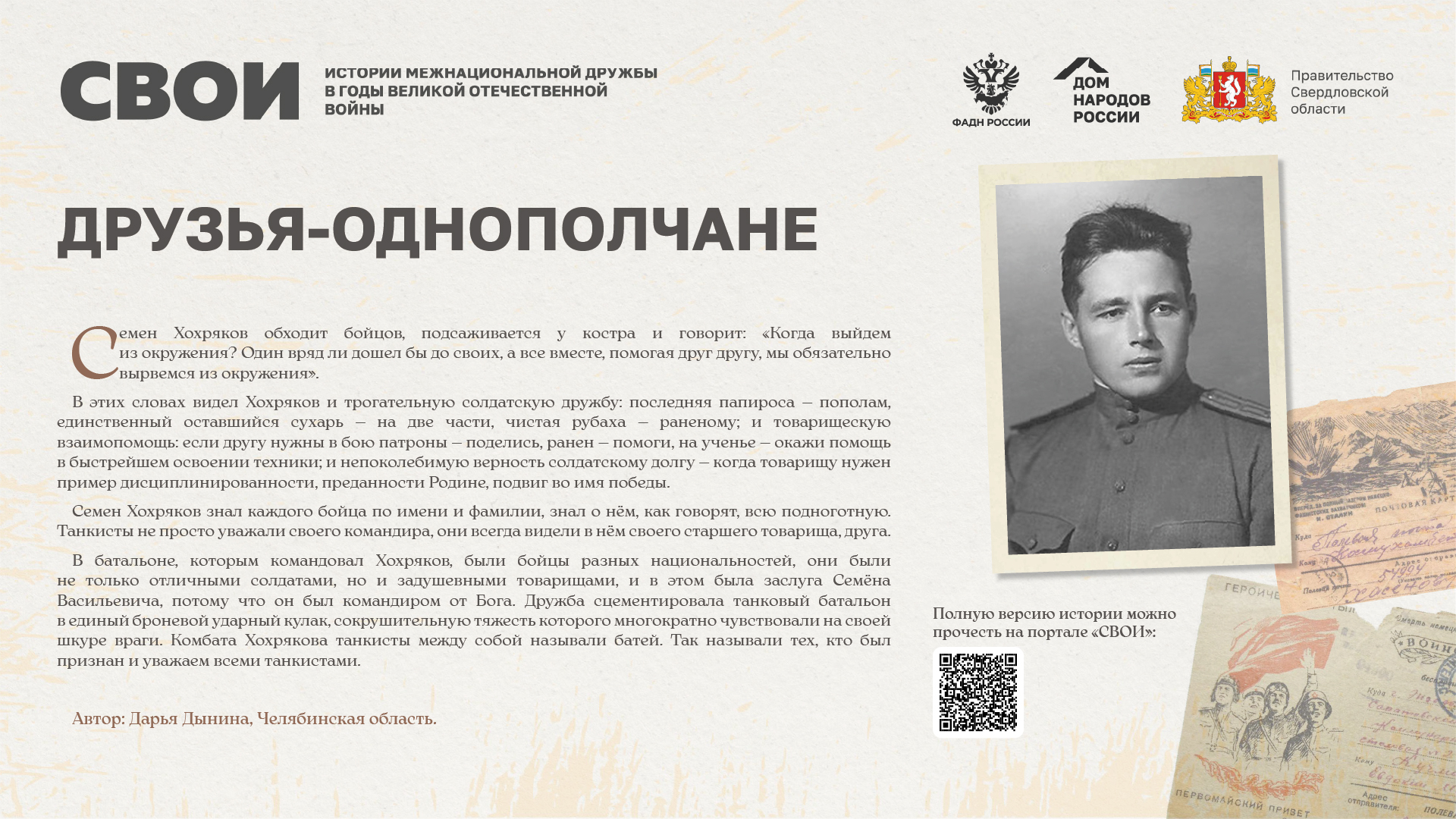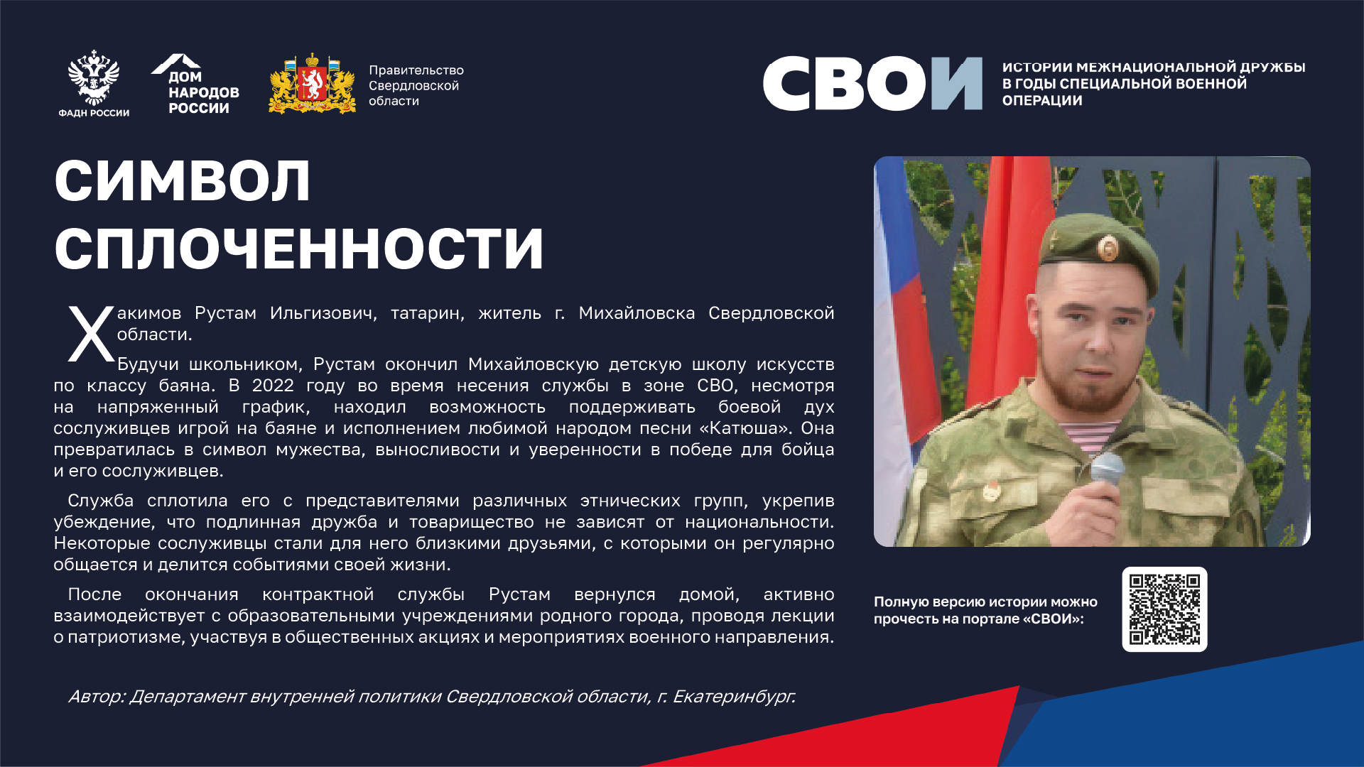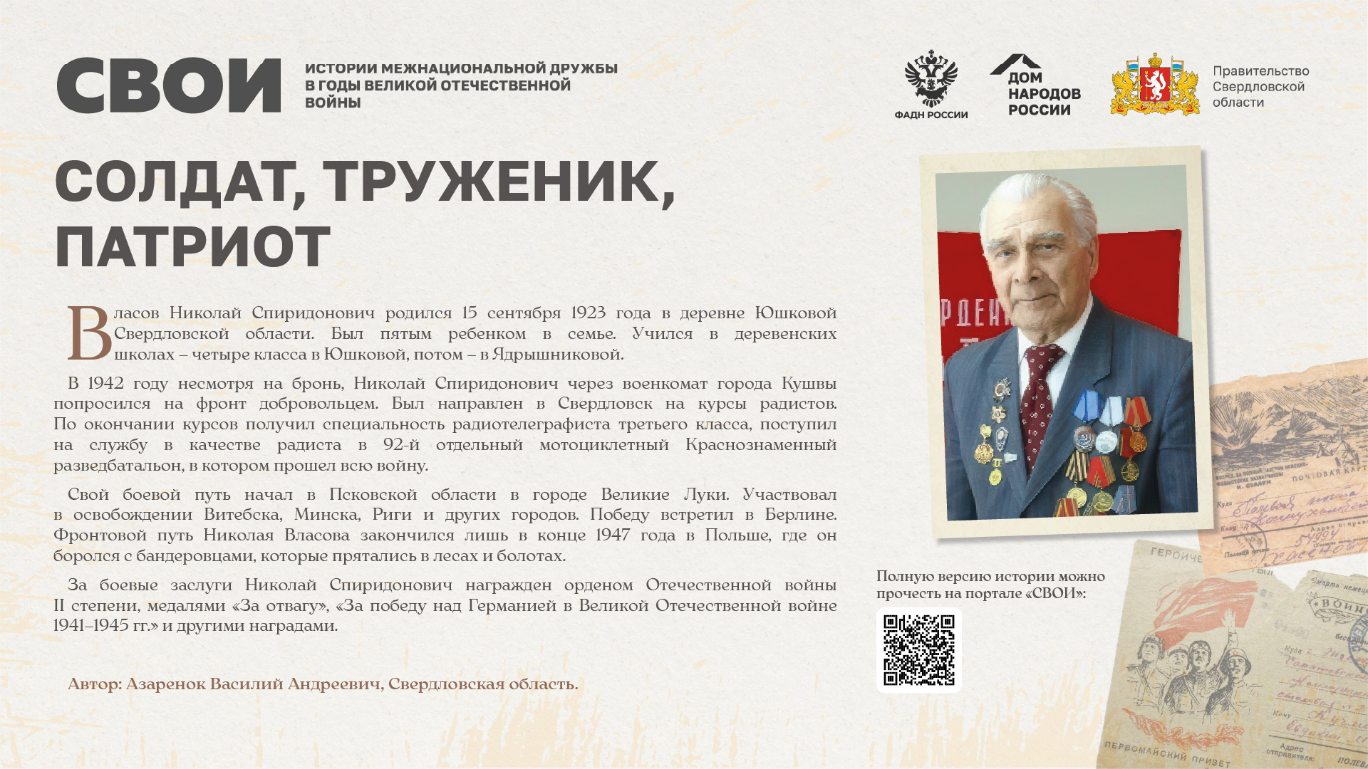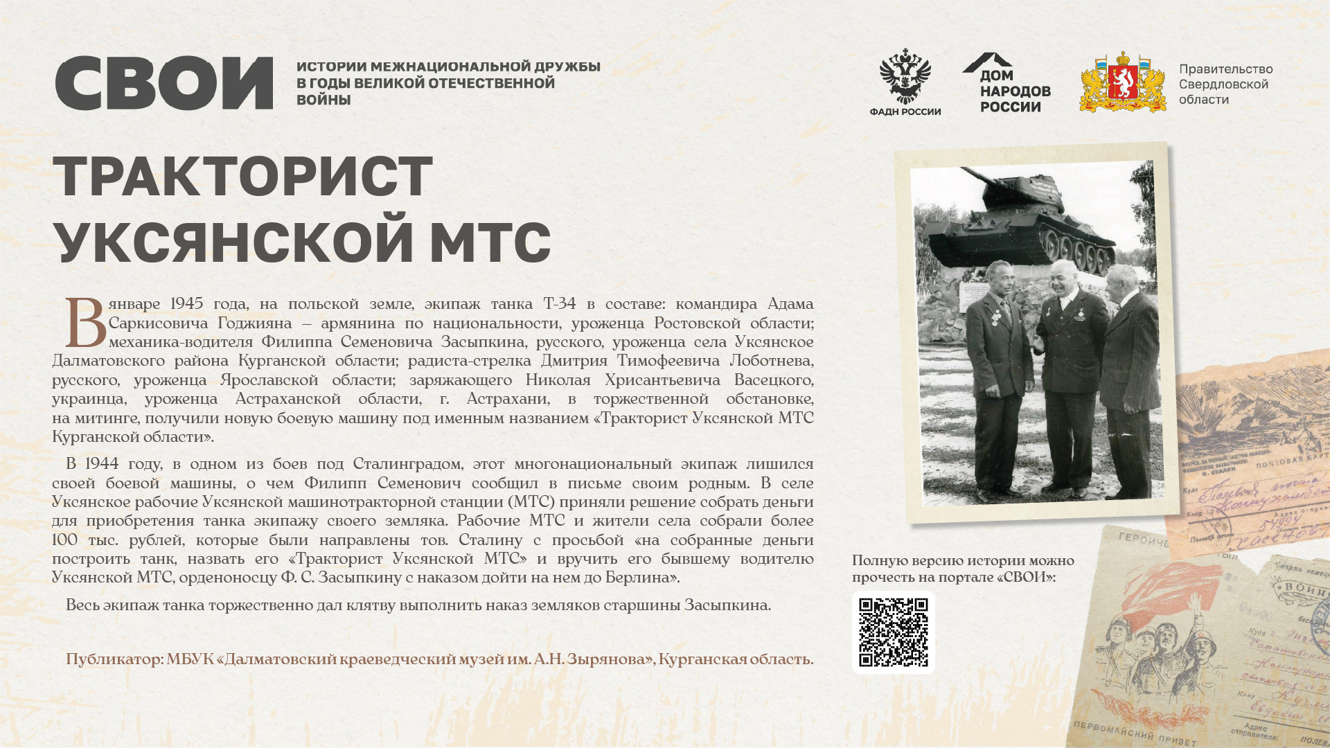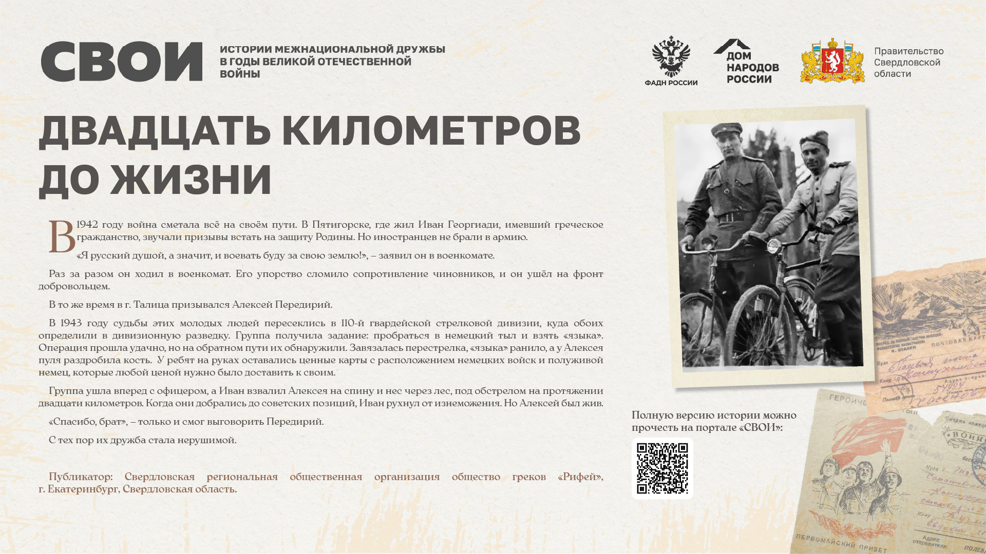 Департаментом внутренней политики Свердловской области во взаимодействии с ФБУ «Дом народов России» создана межрегиональная патриотическая выставка «СВОИ», в которую вошли 20 историй о героях Великой Отечественной войны и специальной военной операции