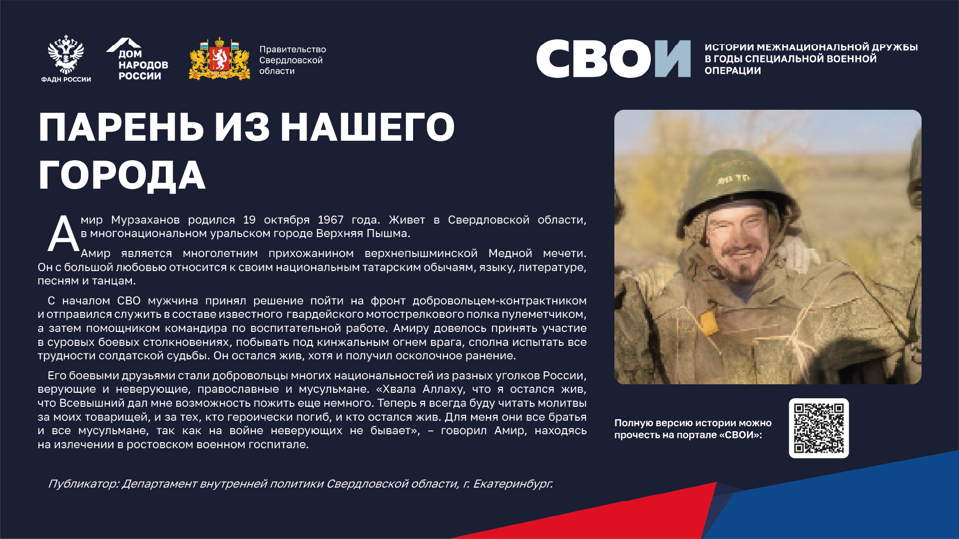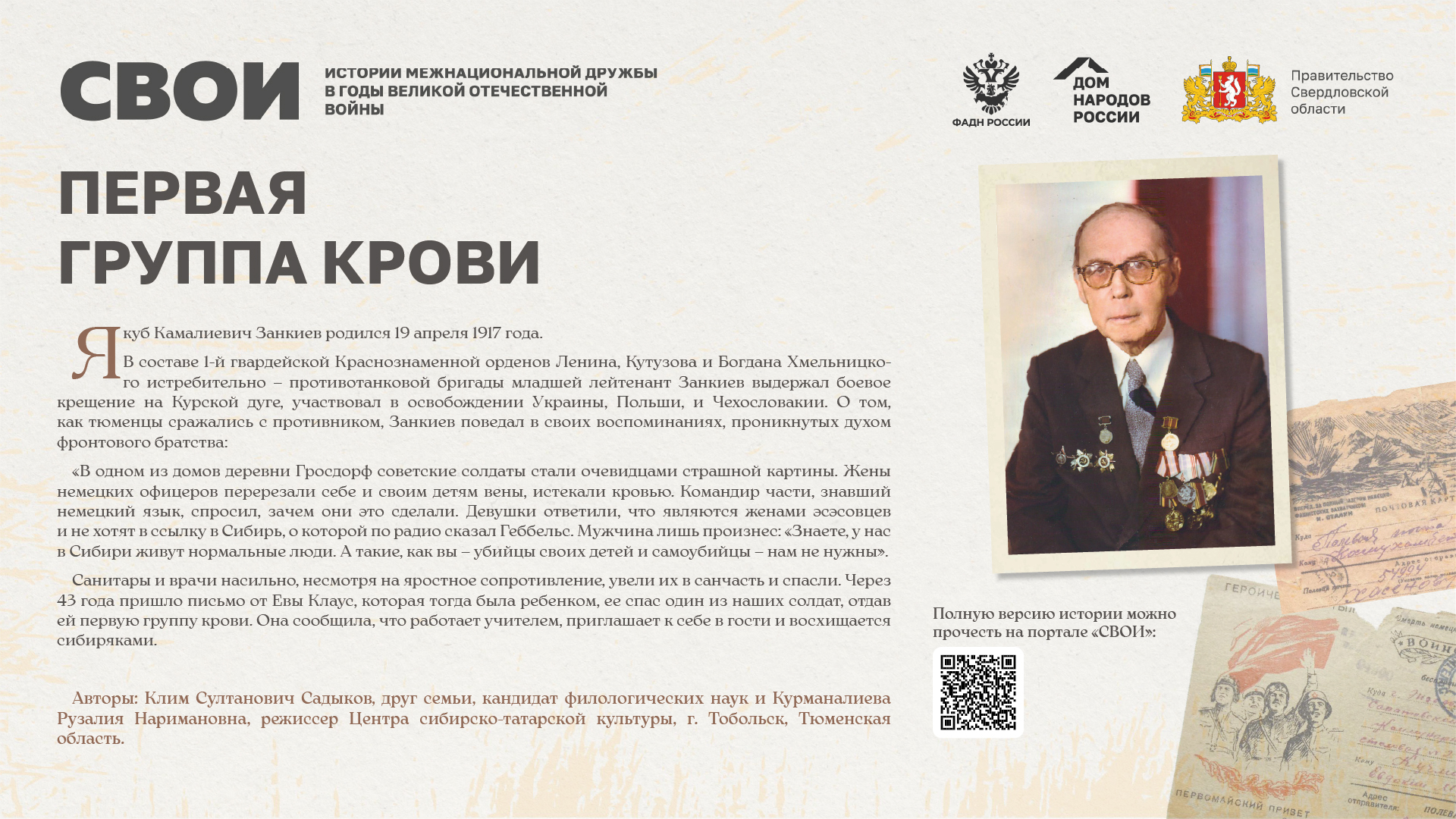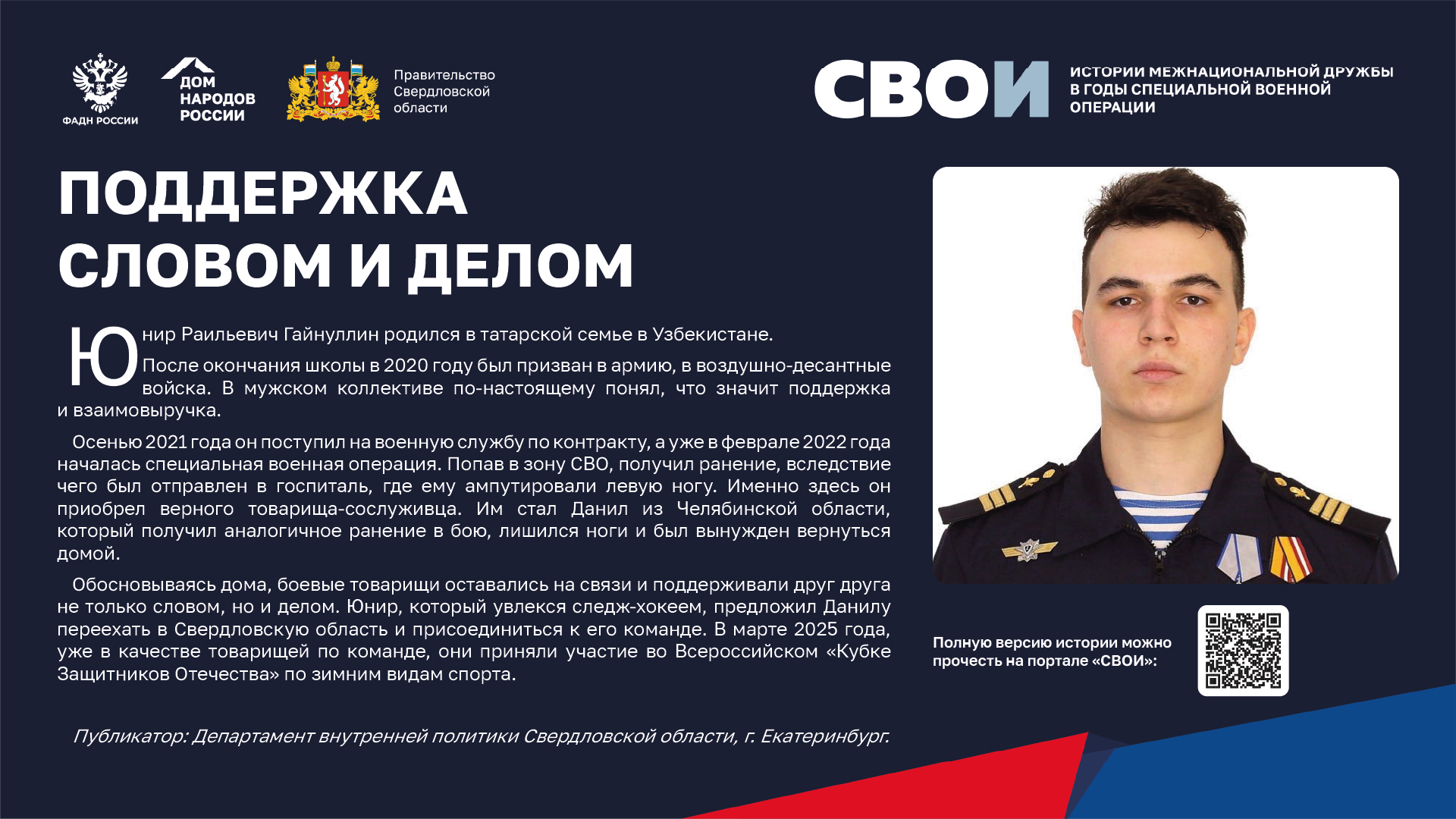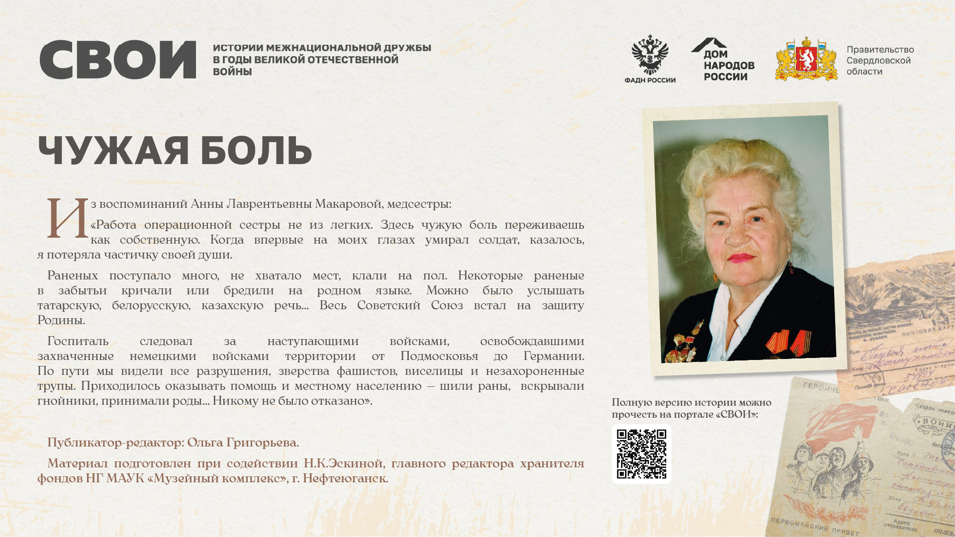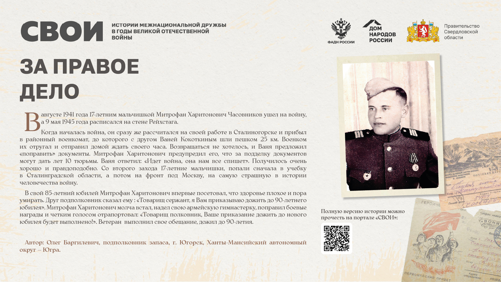 Департаментом внутренней политики Свердловской области во взаимодействии с ФБУ «Дом народов России» создана межрегиональная патриотическая выставка «СВОИ», в которую вошли 20 историй о героях Великой Отечественной войны и специальной военной операции
