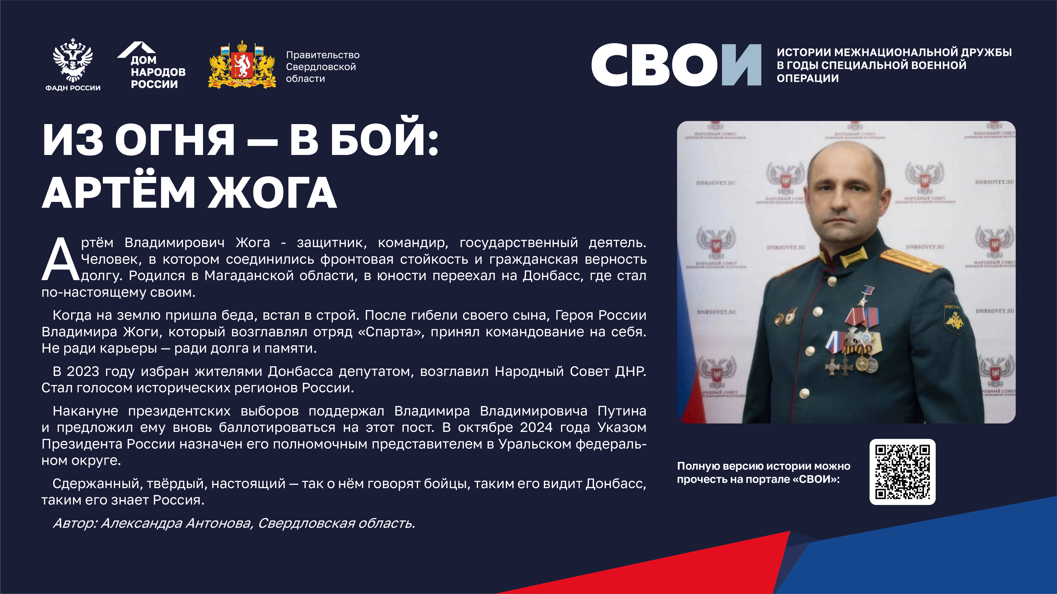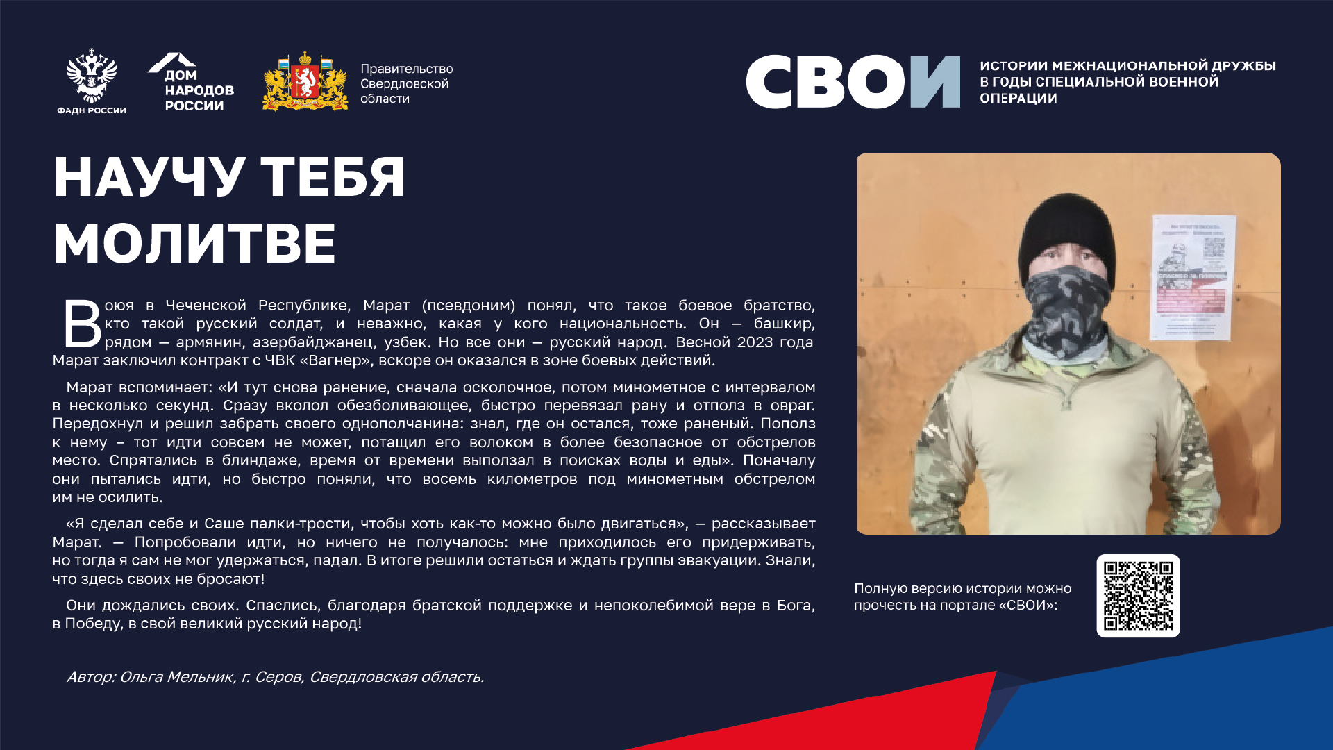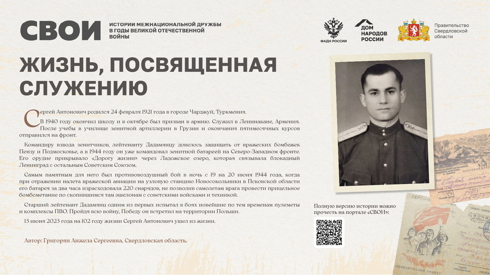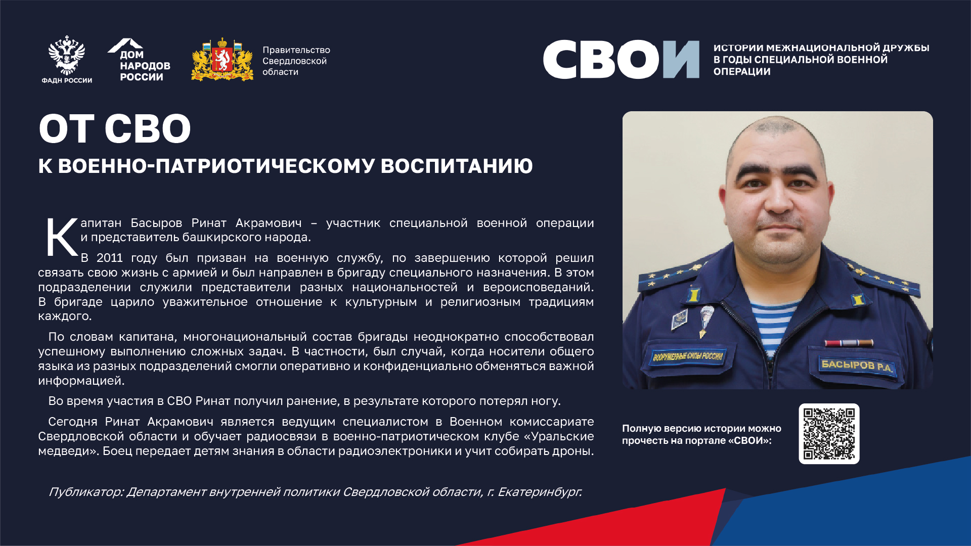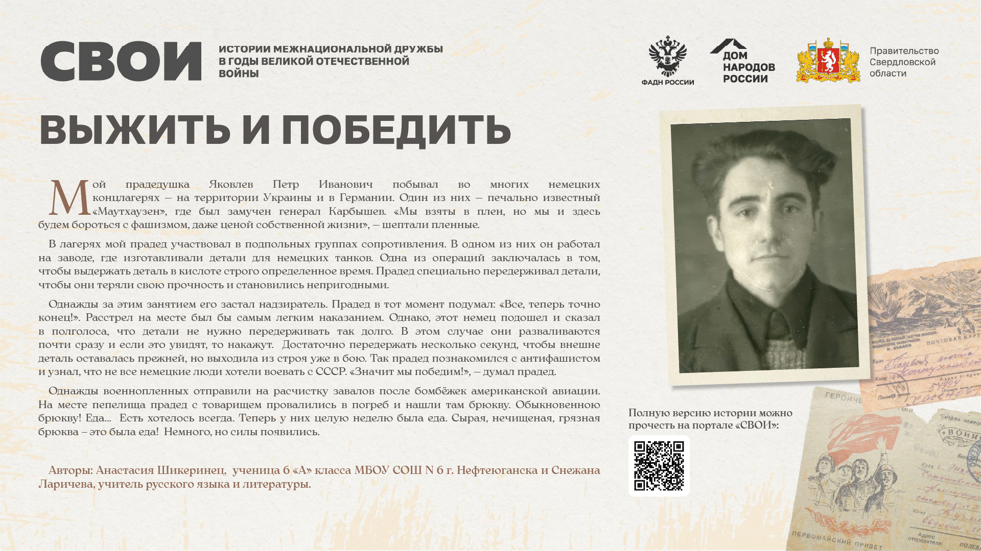 Департаментом внутренней политики Свердловской области во взаимодействии с ФБУ «Дом народов России» создана межрегиональная патриотическая выставка «СВОИ», в которую вошли 20 историй о героях Великой Отечественной войны и специальной военной операции