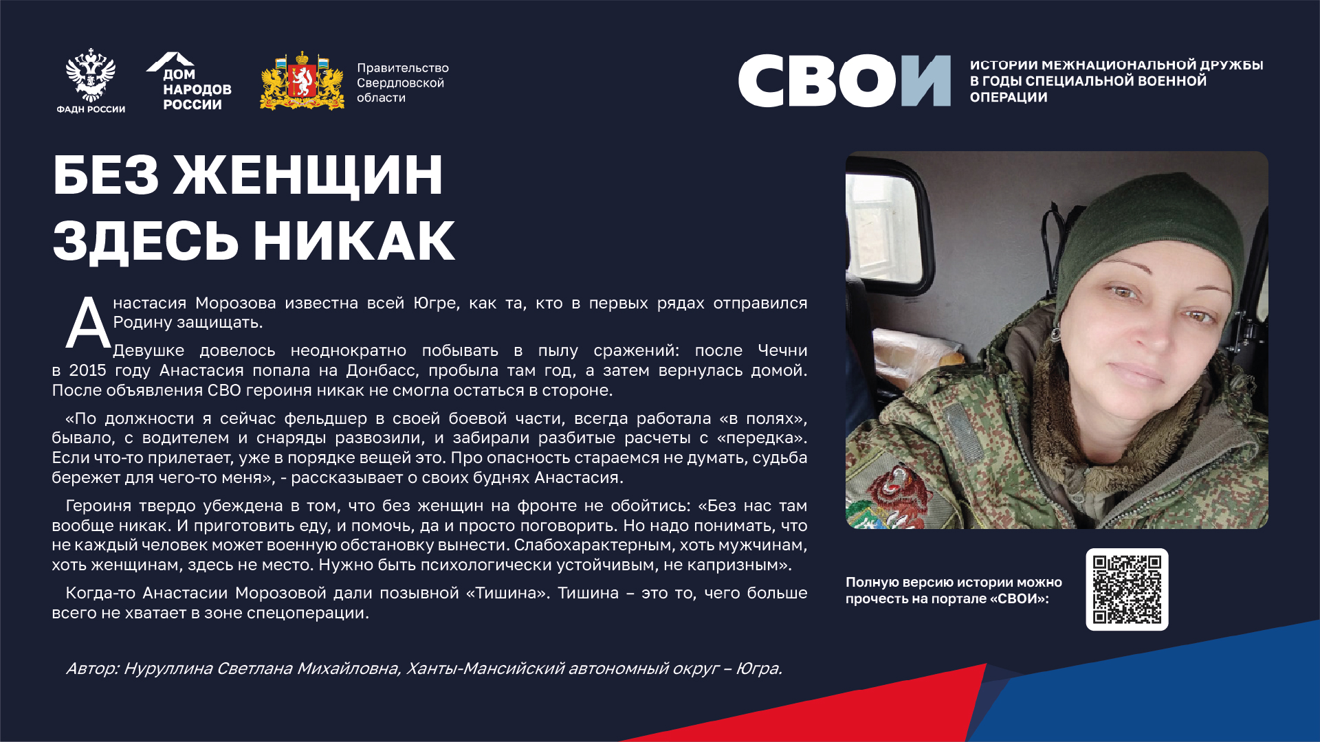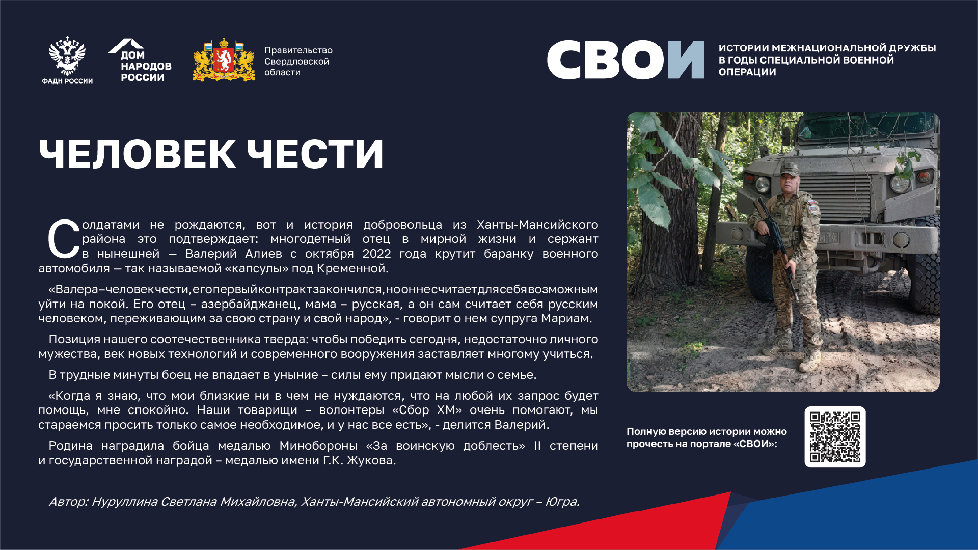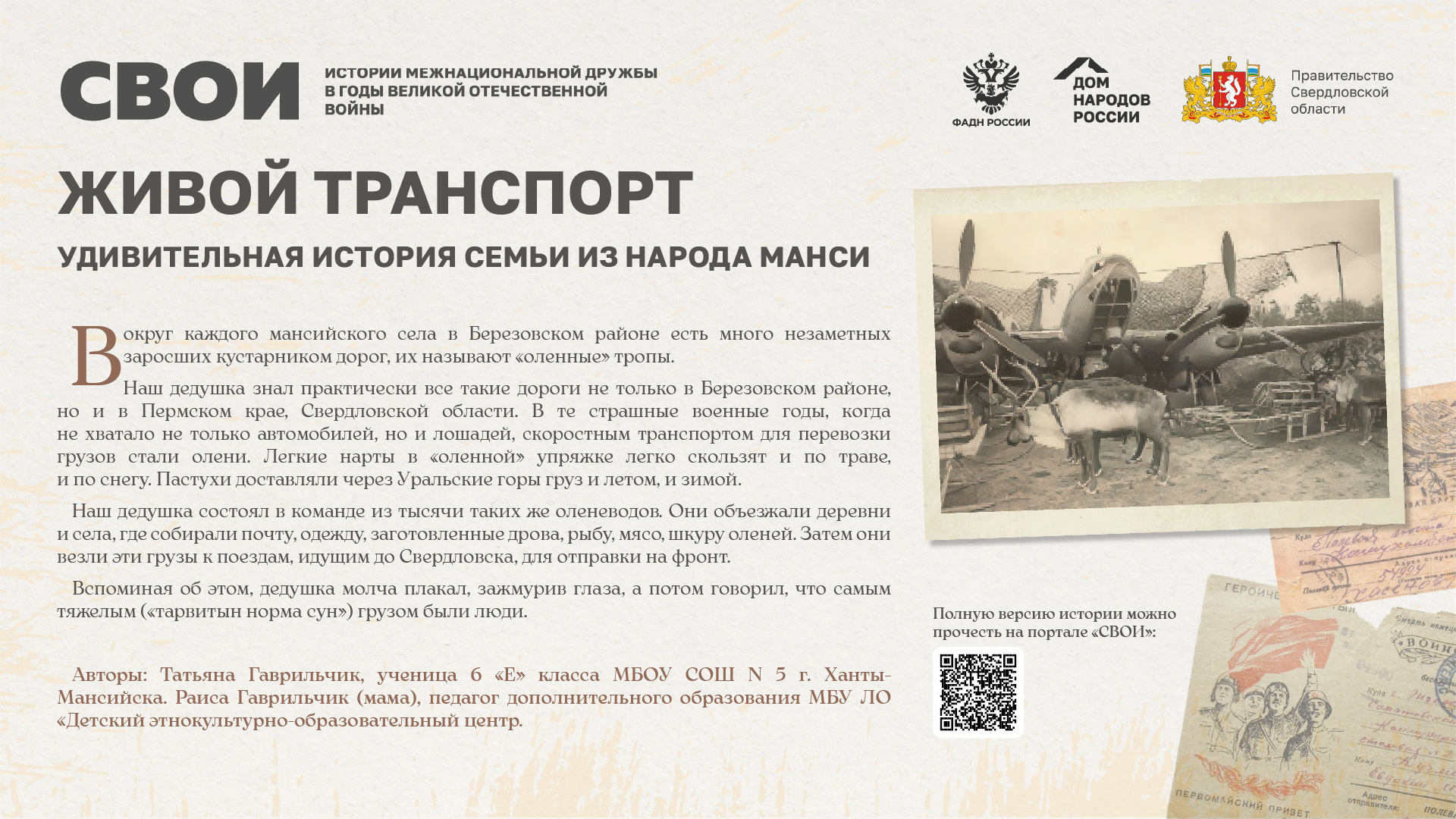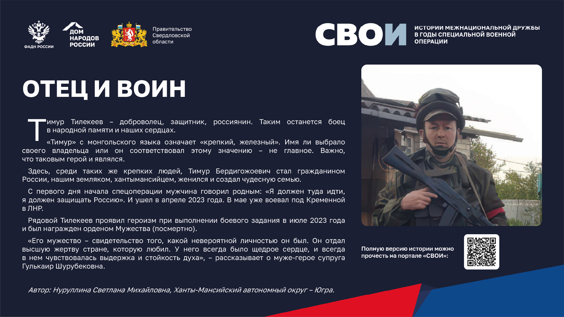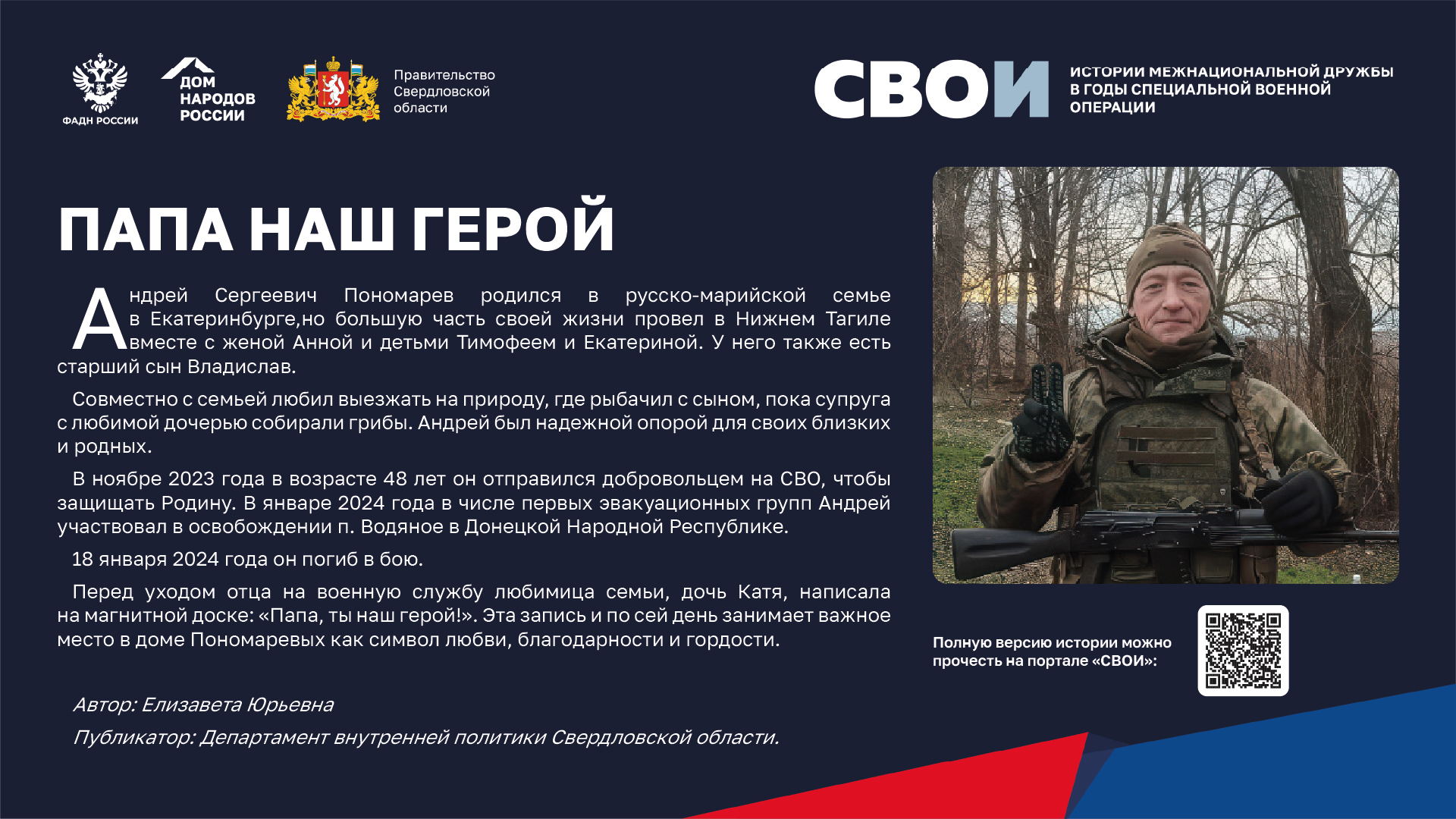 Департаментом внутренней политики Свердловской области во взаимодействии с ФБУ «Дом народов России» создана межрегиональная патриотическая выставка «СВОИ», в которую вошли 20 историй о героях Великой Отечественной войны и специальной военной операции