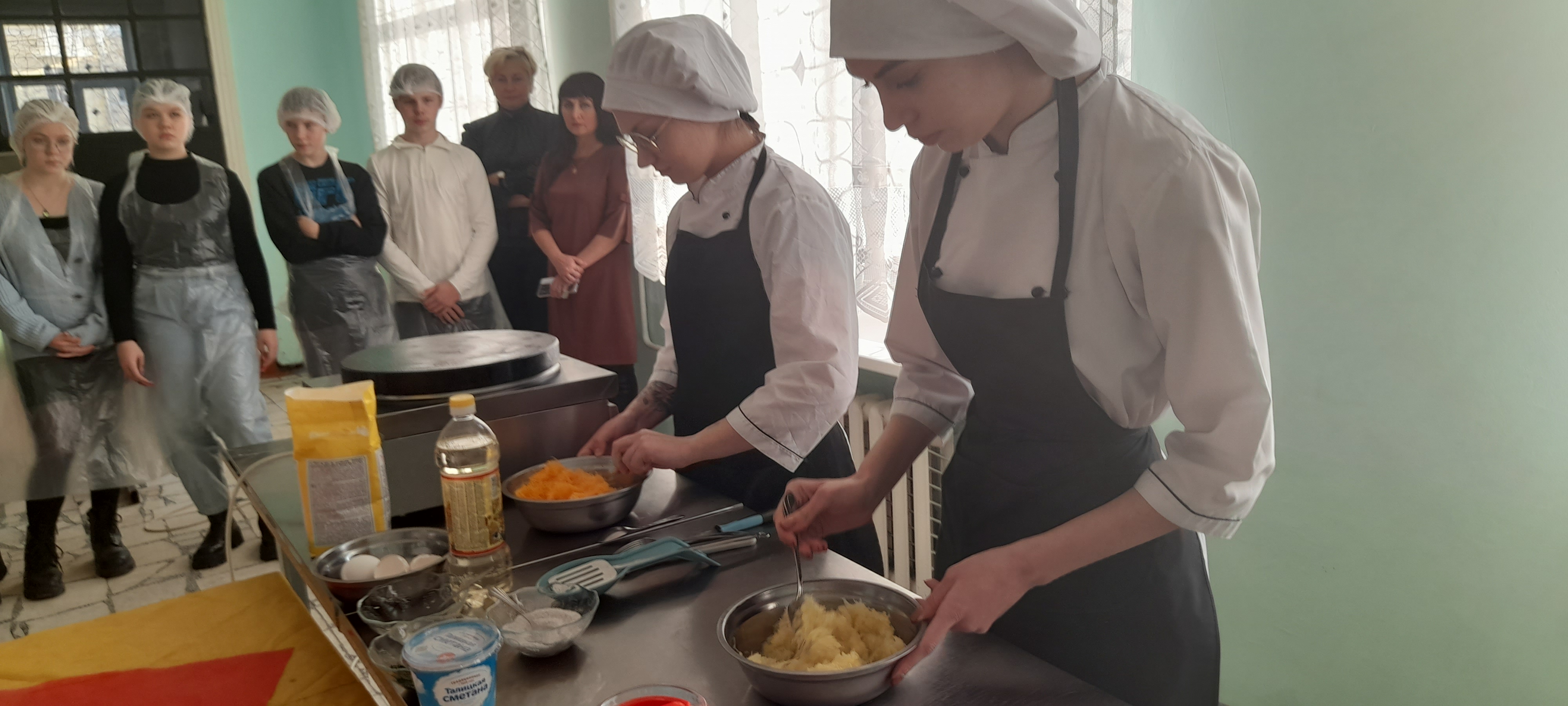 Студенты техникума провели для выпускников мастер-класс, они наглядно продемонстрировали ребятам, как в домашних условиях можно быстро и просто приготовить вкуснейшие оладьи.