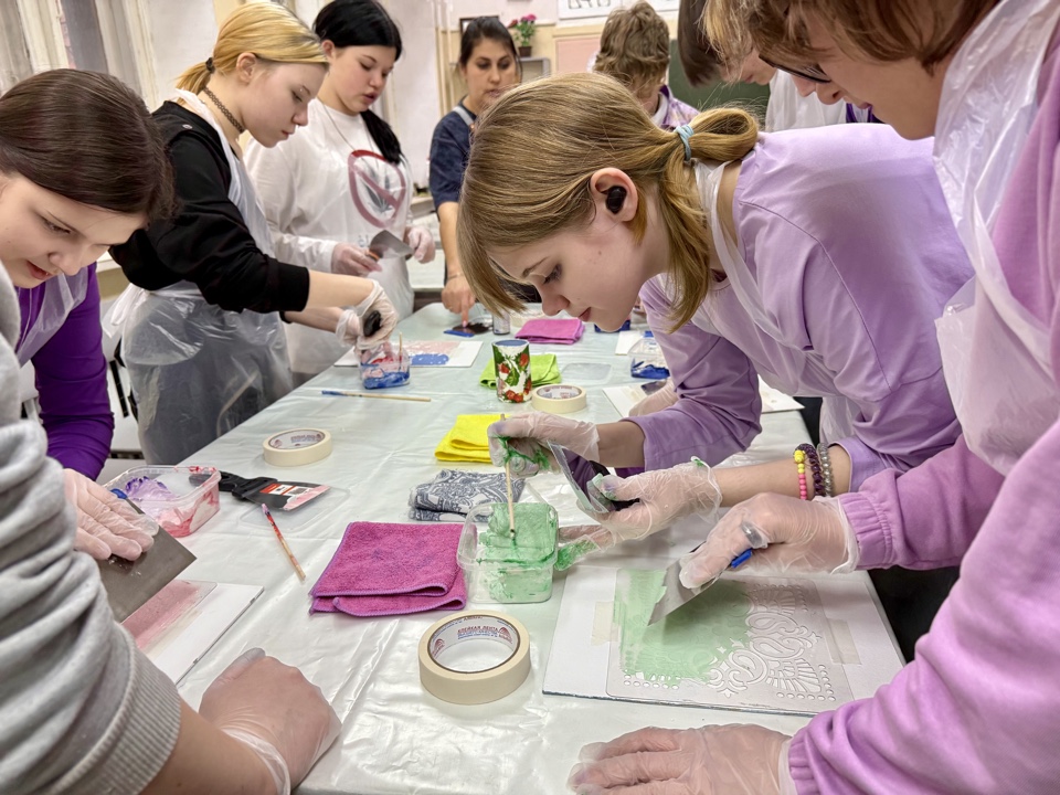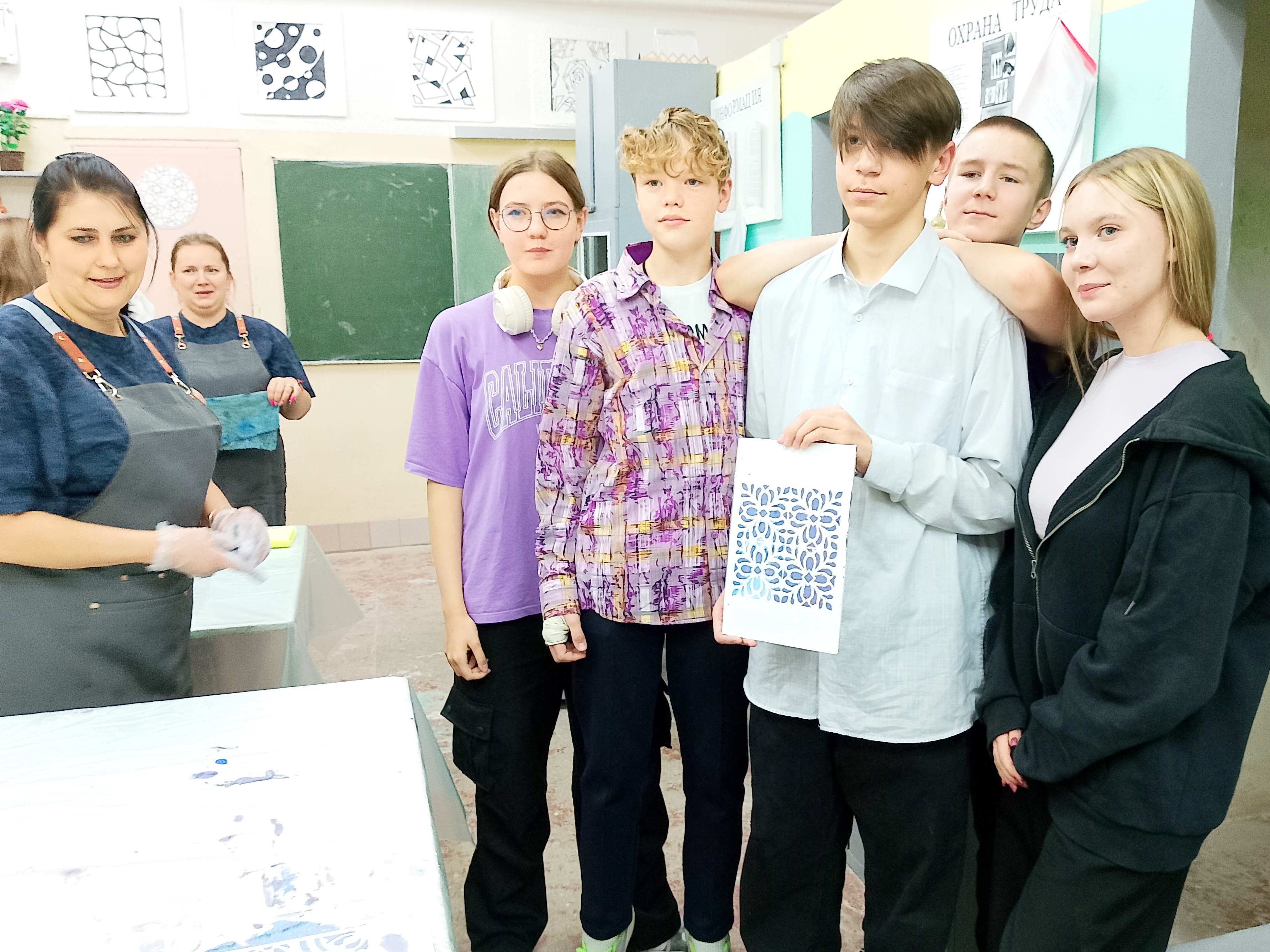 Ребятам была предоставлена перспектива попробовать свои возможности, используя трафареты, краски и шпатели, проявить навыки в декорировании поверхности, оформить её на свой вкус, школьники выполняли нанесение объёмного трафарета в 2 тона. Сначала поставленная задача казалась непреодолимой, но под руководством опытных наставников всё получилось!