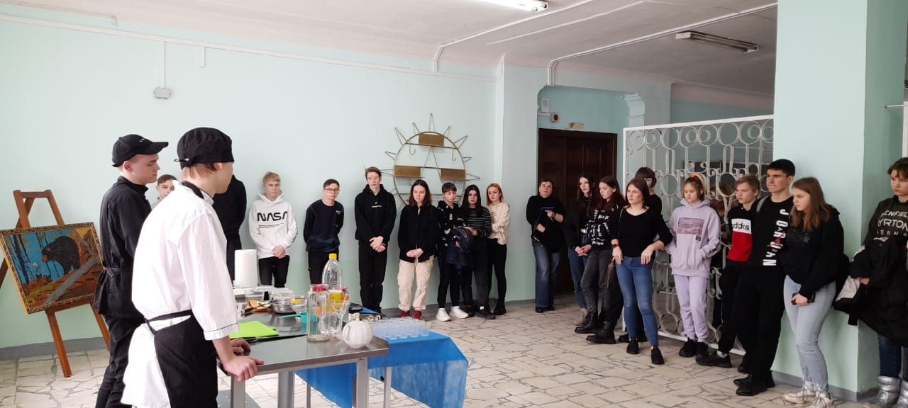 На мероприятии ребята ознакомились с одной из самых востребованных на сегодняшний день специальностью «Поварское и кондитерское дело». Студенты техникума провели для выпускников мастер-класс, они наглядно продемонстрировали ребятам, как в домашних условиях можно быстро и просто приготовить вкуснейшие роллы. Ребята лично участвовали в приготовлении и очень внимательно наблюдали за работой студентов. Также четверокурсники продемонстрировали, как из простой газировки сделать вкуснейший и ароматный напиток, с добавлением всего лишь, всем нам известных продуктов (лимона, мяты и сахара). Мастера производственного обучения Ястребова А.О., Казакова И.А. и Гринашко М.В. рассказали все тонкости, плюсы и минусы данной специальности, популярные направления и специализации, какими качествами должен обладать повар, о производственной практики студентов.