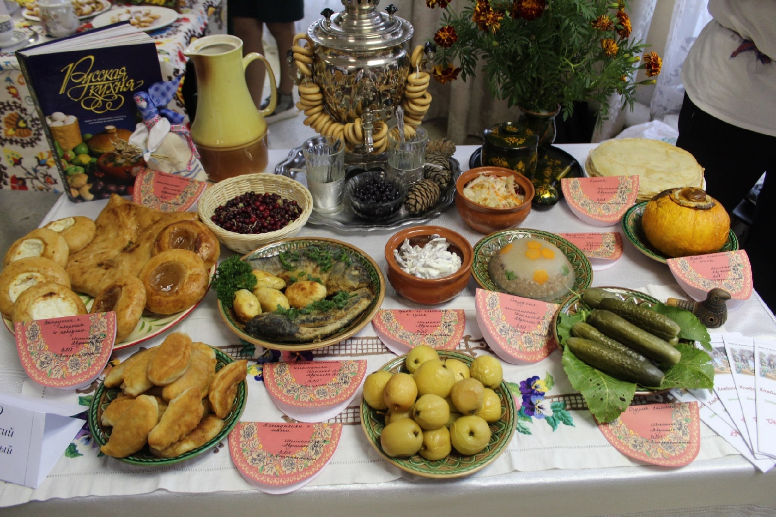 Ребята и мастера своими руками приготовили вкуснейшие холодные закуски и выпечку. Наш стол был оформлен в исконно русских традициях. На суд жюри были презентованы: капуста квашеная с клюквой, яблоки моченые, студень, "Рыжики" в сметане, огурцы соленые, карась жареный, пшенная каша в тыкве ("Тыквенник"), "Посекунчики", ватрушки с творогом и яблочным повидлом.