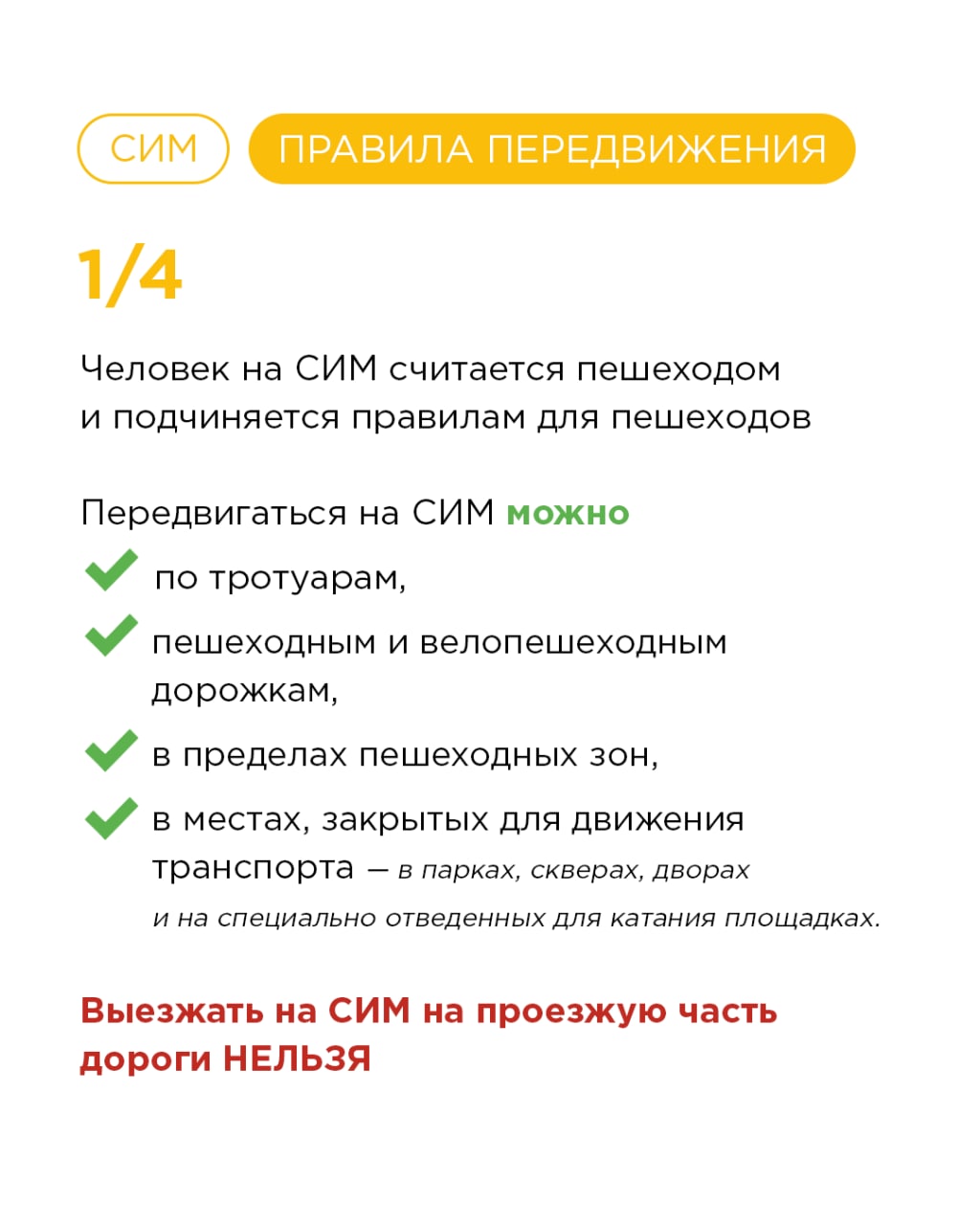 Воздержитесь от передвижения на СИМ при недостаточной освещённости, в узких пространствах, при больших скоплениях людей, а также в местах, где много помех и препятствий.