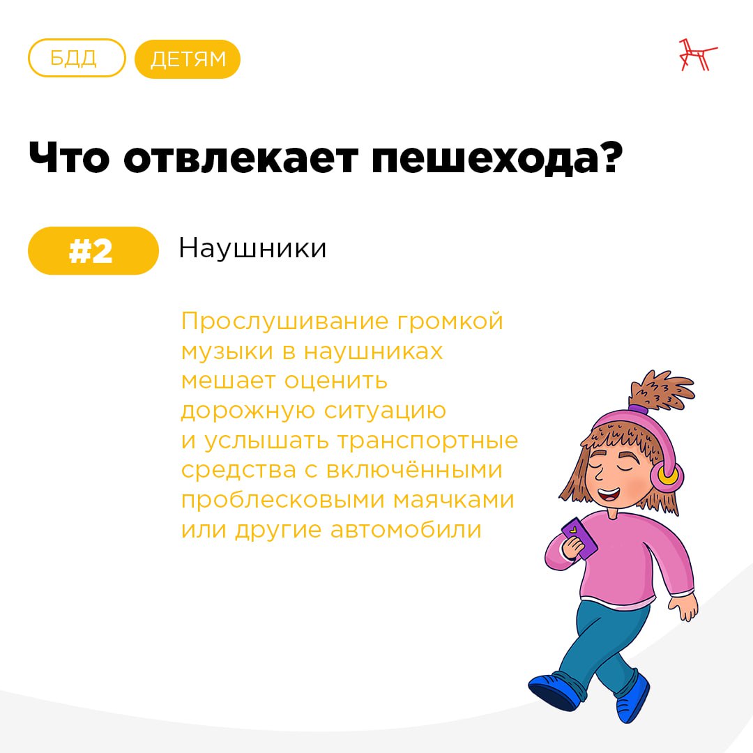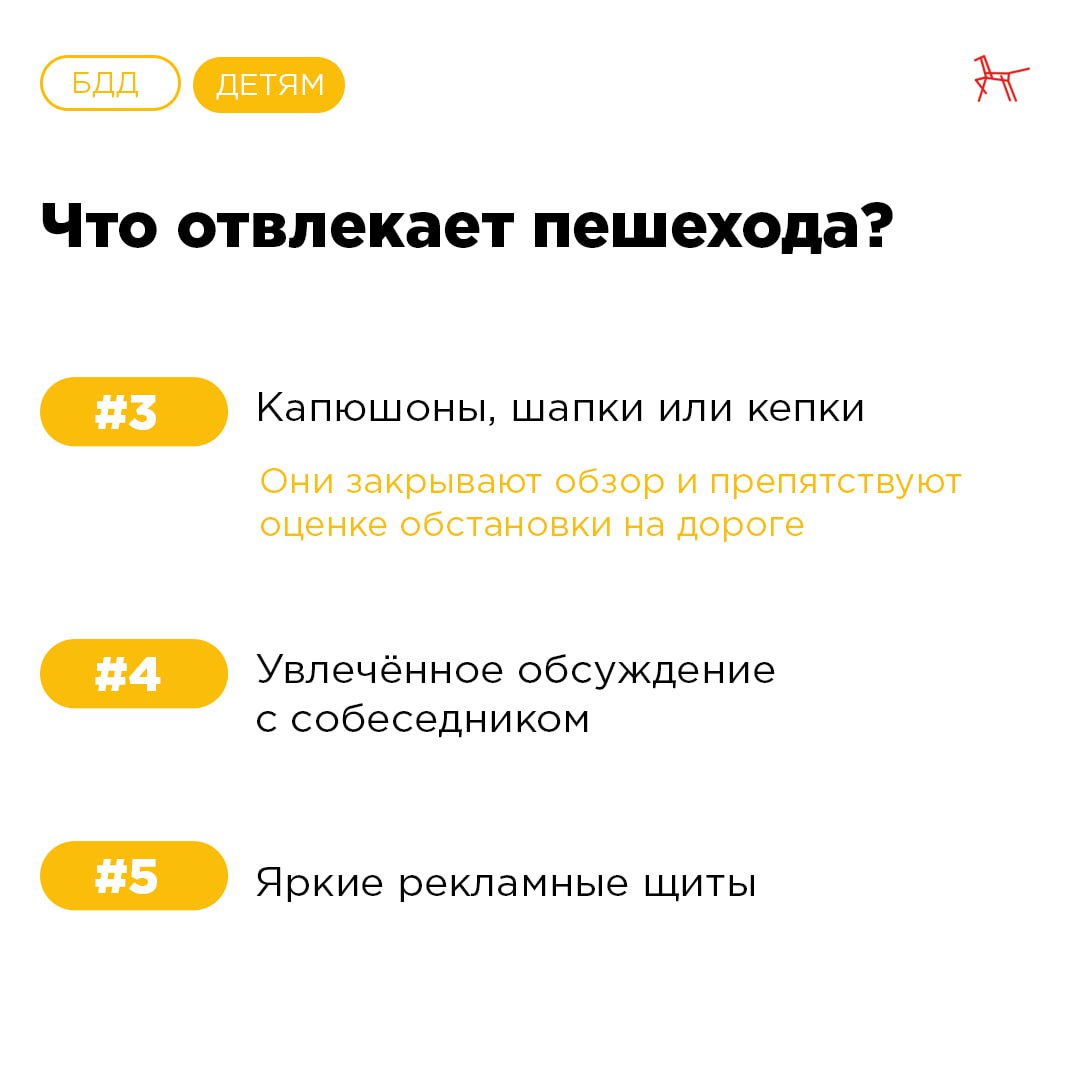 Чтобы пешеходу оставаться в безопасности нужно оставаться внимательным вблизи проезжей части дороги и при её переходе. Центр по профилактике ДДТТ Института воспитания подготовил карточки, где собраны основные факторы, отвлекающие внимание пешеходов.
