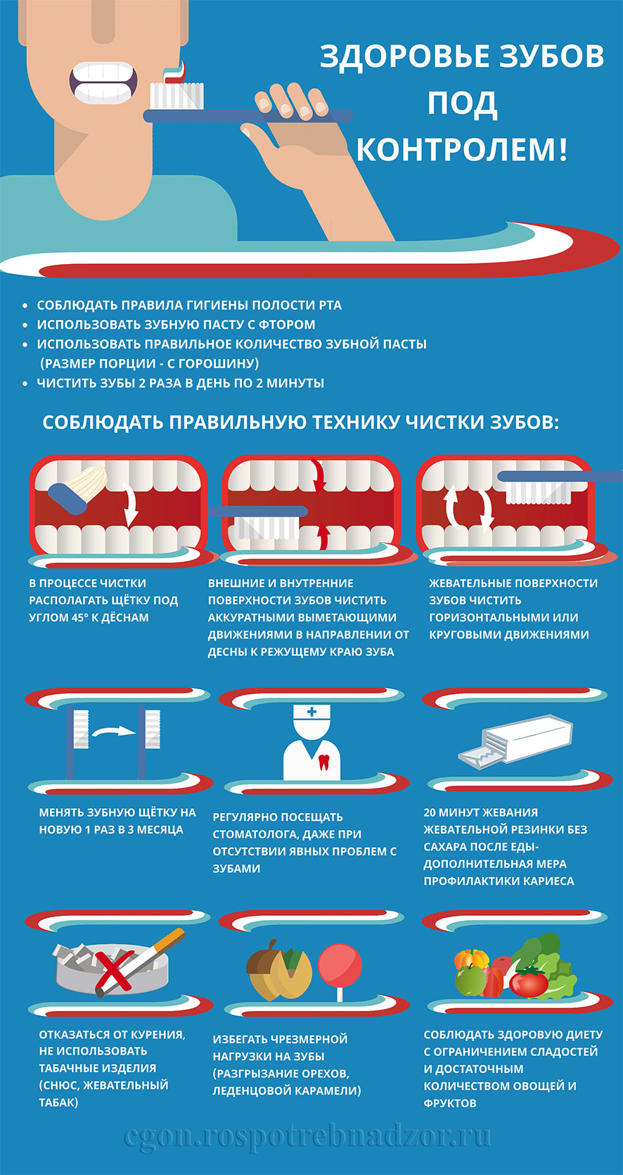 Здоровье полости рта начинается с чистых зубов. Исследования подтверждают преимущество использования зубных паст со фтором, как для взрослых, так и для детей с двух лет (со специально рассчитанной концентрацией фтора в соответствии с возрастом).