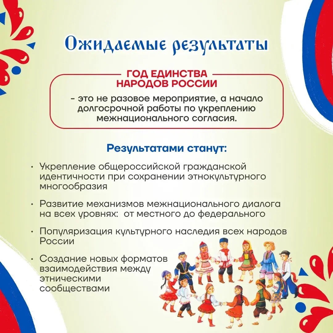 В рамках Года единства народов России планируется широкая программа событий. Она включает фестивали народных культур, выставки, концерты, театральные проекты, а также научные и общественные форумы, посвящённые вопросам межнациональных отношений.