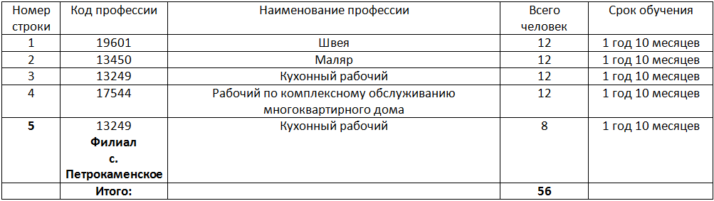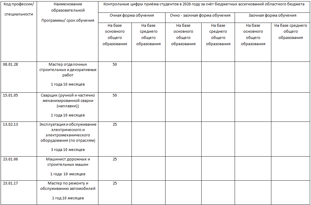 Контрольные цифры приёма по адаптированным программам профессионального обучения по профессиям рабочих, должностям служащих за счёт бюджетных ассигнований областного бюджета на 2026/2027 учебный год